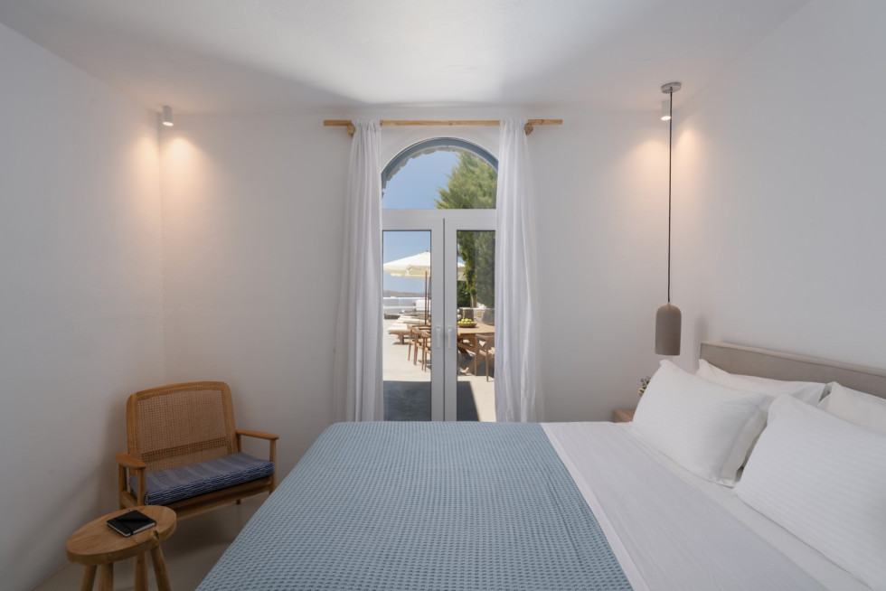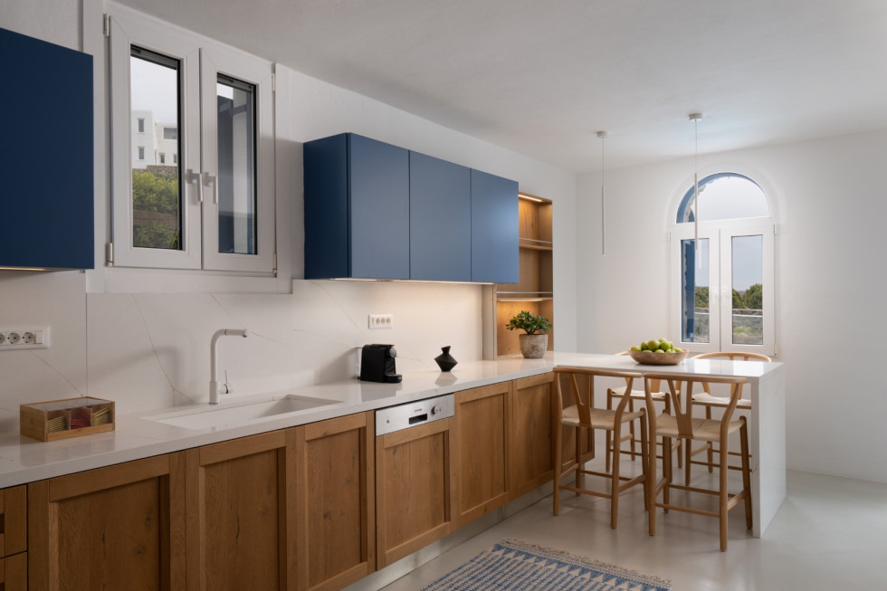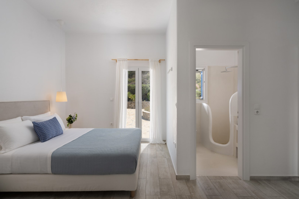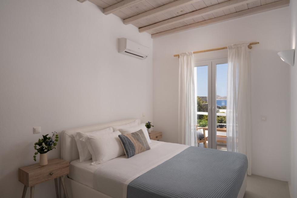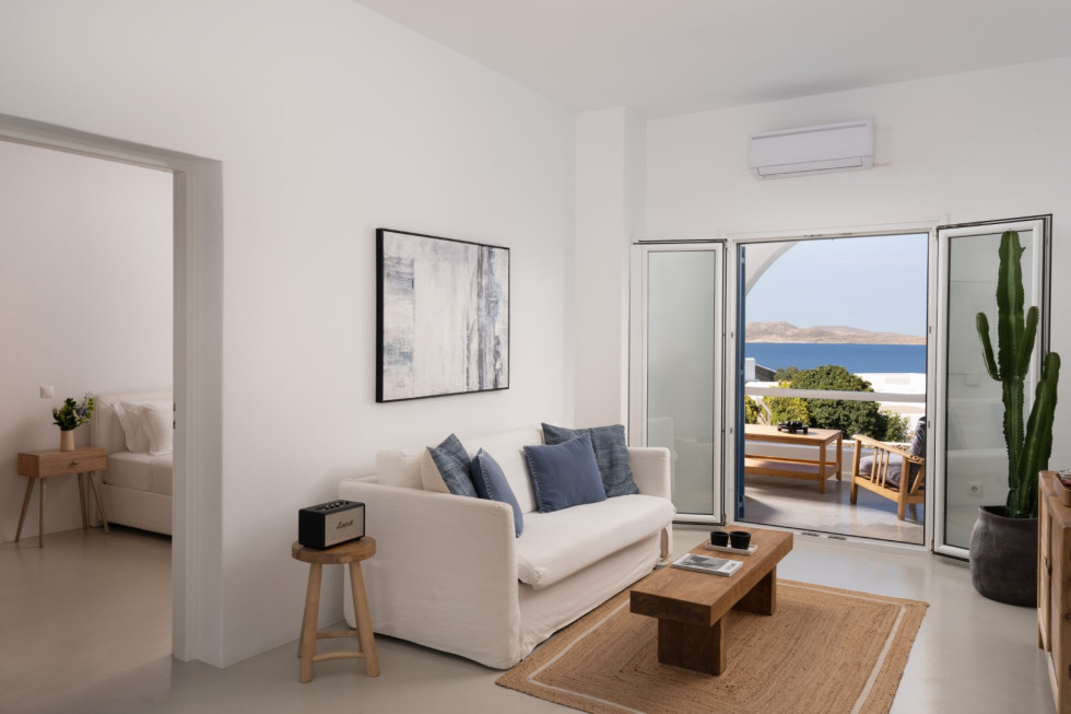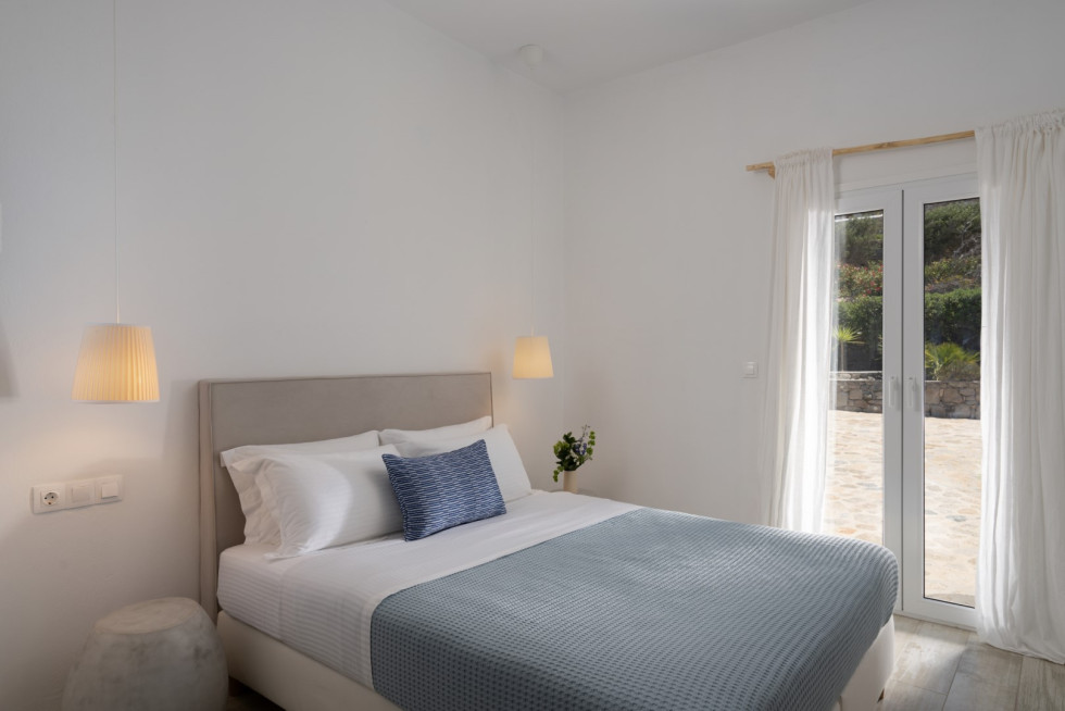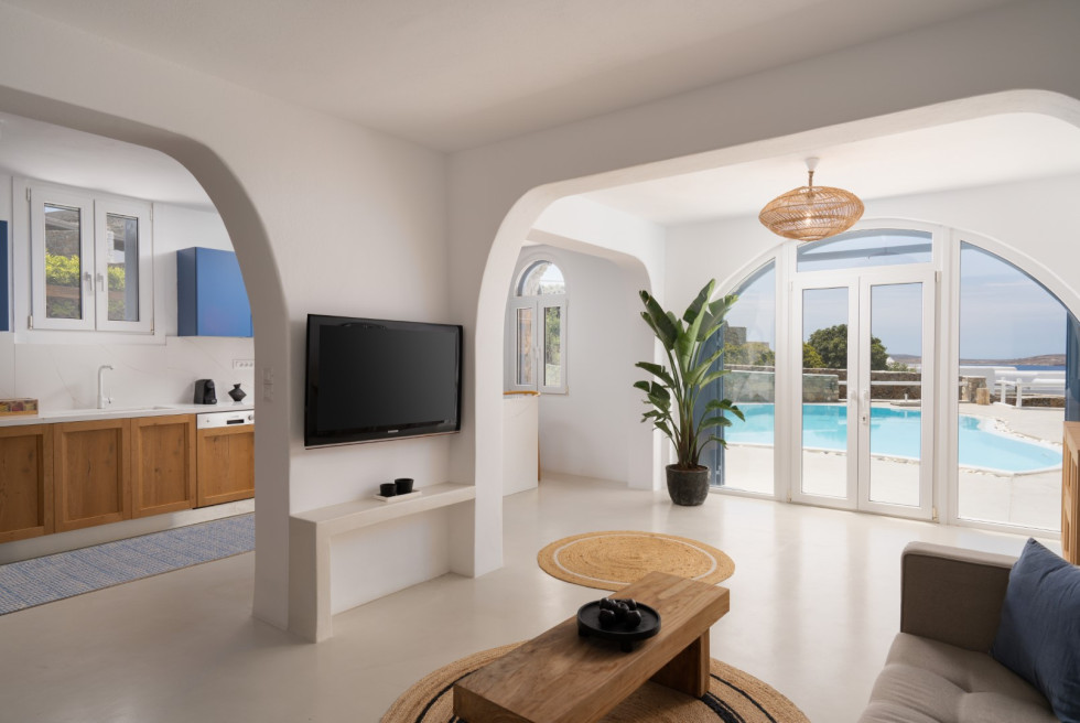 Villa Athella’s design masterfully combines contemporary elegance with Cycladic simplicity. Natural materials and minimalist interiors create a serene ambiance, while large glass doors seamlessly connect the interior with the spectacular outdoor spaces, ensuring the stunning views are always in sight.