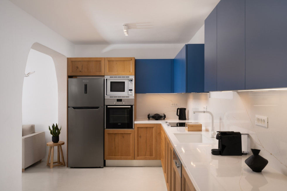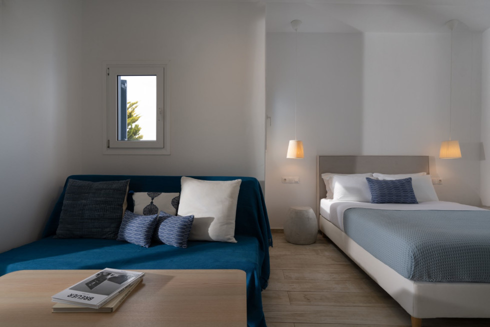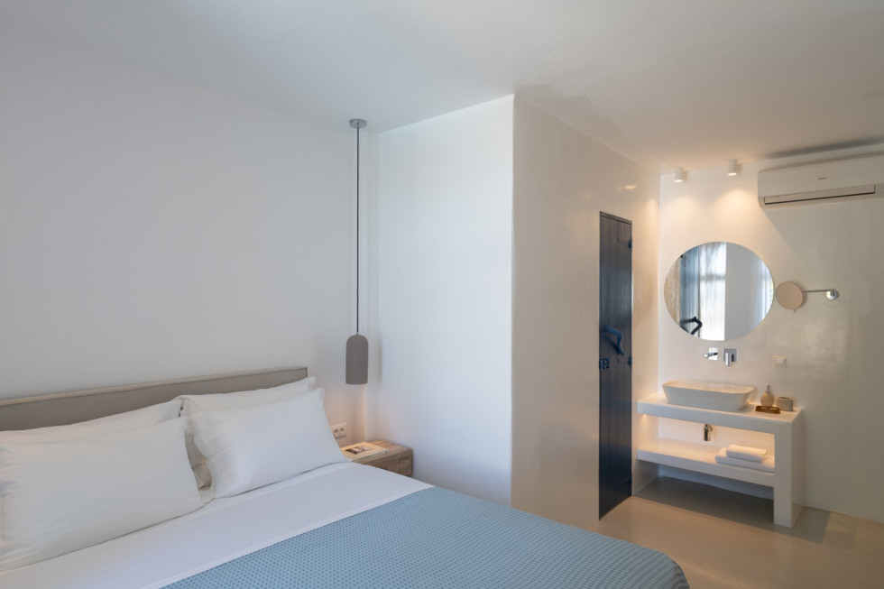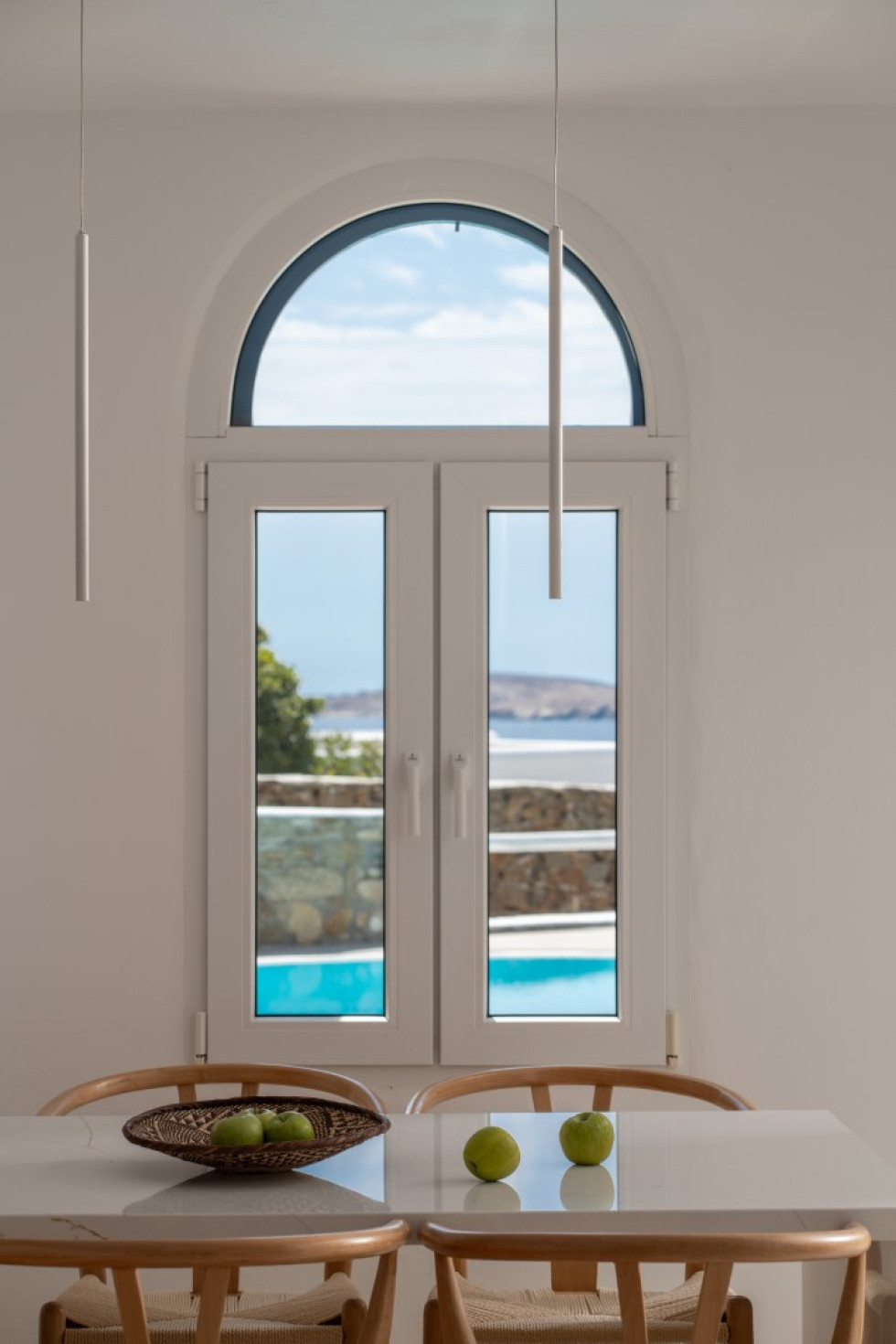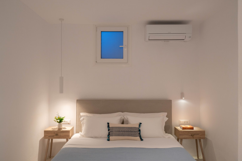 Villa Athella’s design masterfully combines contemporary elegance with Cycladic simplicity. Natural materials and minimalist interiors create a serene ambiance, while large glass doors seamlessly connect the interior with the spectacular outdoor spaces, ensuring the stunning views are always in sight.