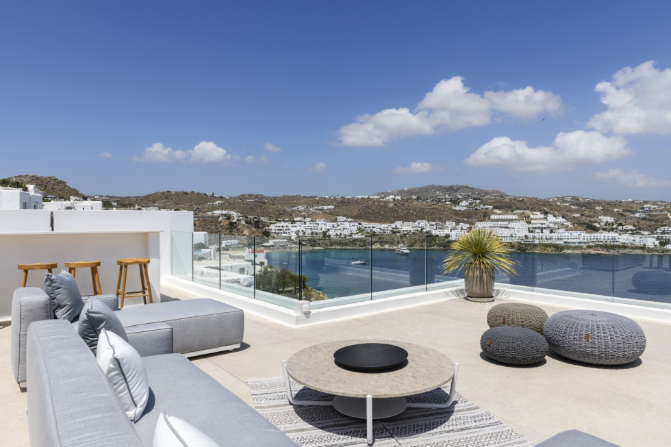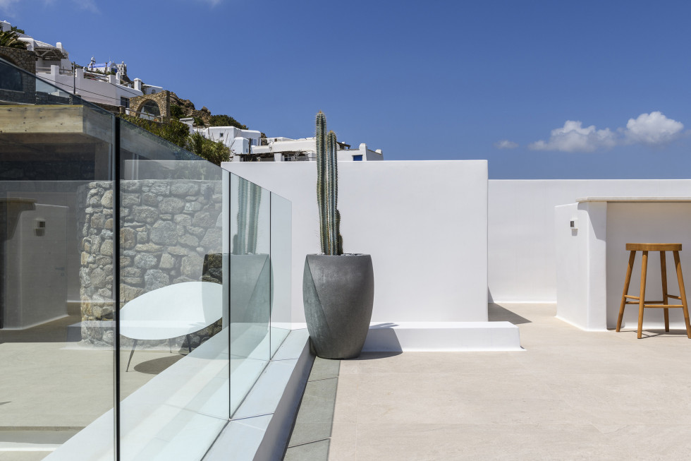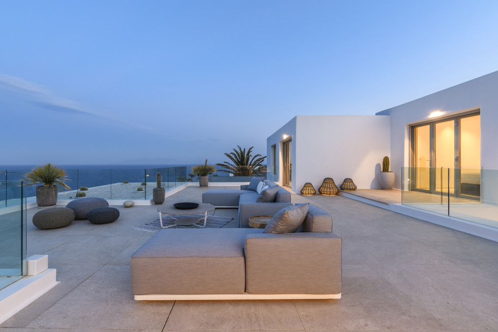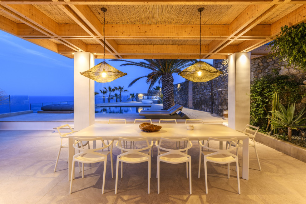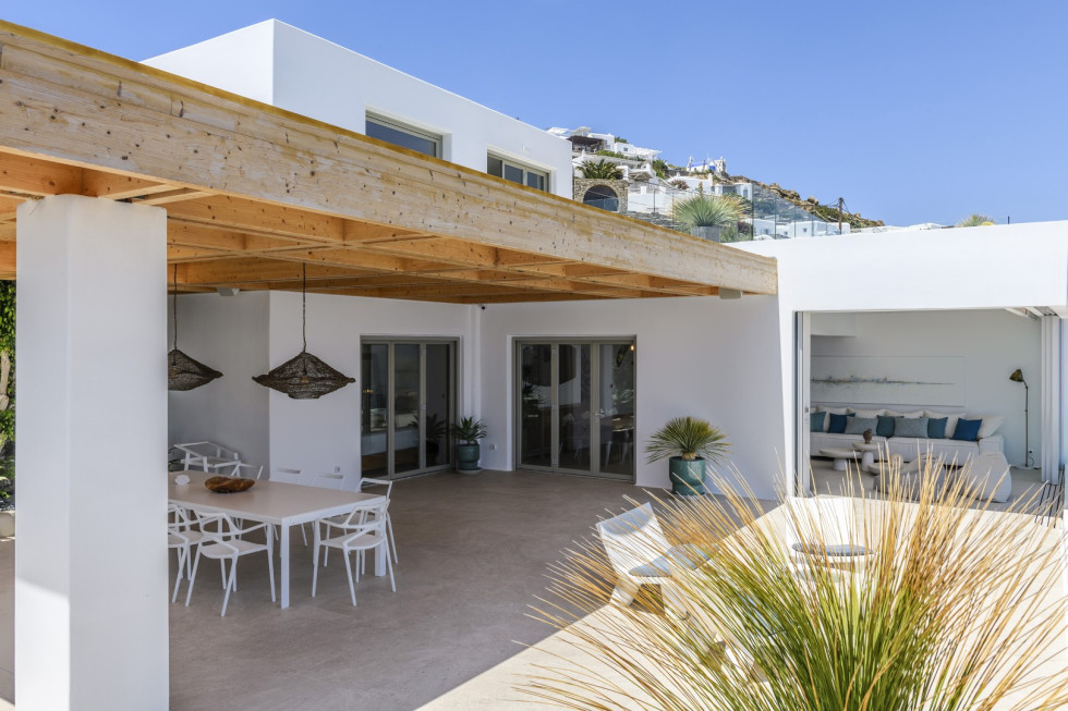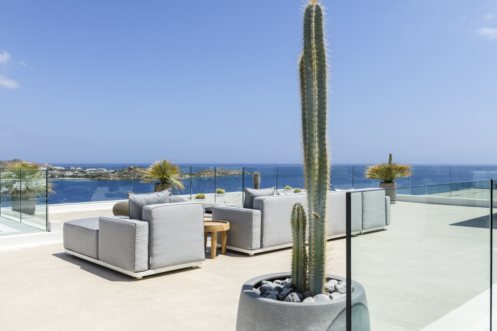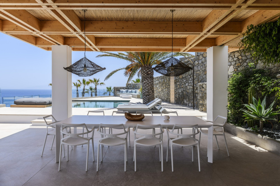 The villa's expansive terrace is the heart of the property, where guests can soak in the Mykonian sun or enjoy alfresco dining against a backdrop of endless blue.